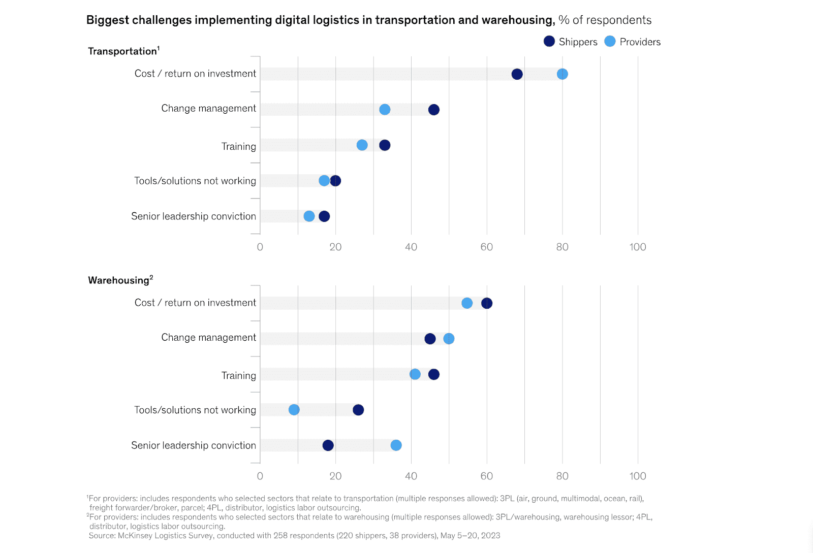 Цифрова трансформація в морській логістиці — це масштабна ініціатива. Очікується, що світовий ринок автоматизації логістики зросте з приблизно 68,5 мільярда доларів США у 2023 році до близько 109,8 мільярда доларів США до 2028 року, що відображає обсяг інвестицій у цю сферу. Для досягнення такого рівня цифрової зрілості потрібні значні початкові витрати.