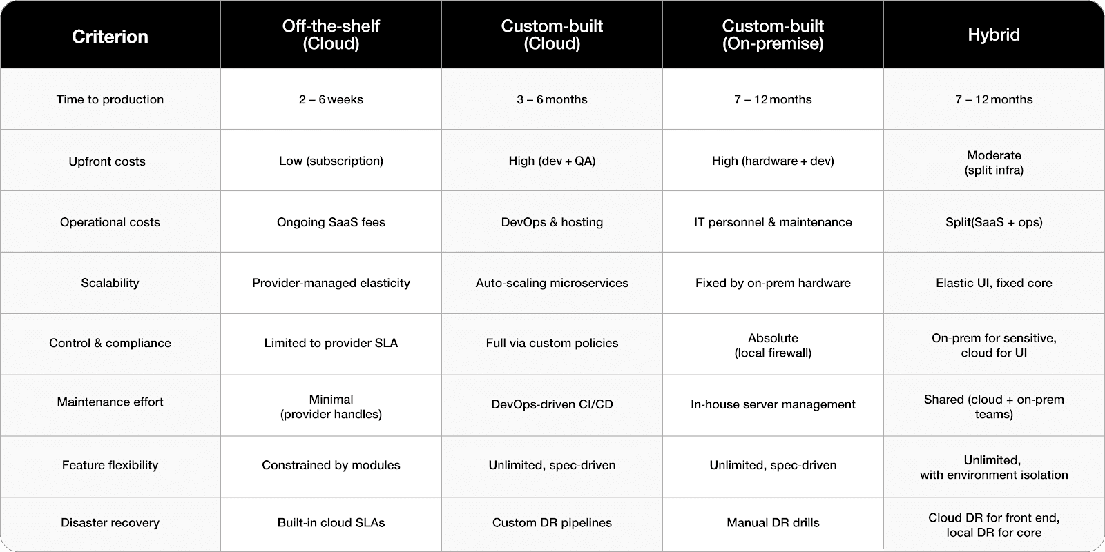 Ця архітектурна матриця має допомогти вашим технічним і операційним керівникам визначити оптимальну комбінацію типу платформи та моделі розгортання — збалансувавши швидкість впровадження, економічну ефективність, відповідність вимогам і майбутнє зростання — для підтримки ваших амбіцій у сфері морських перевезень.