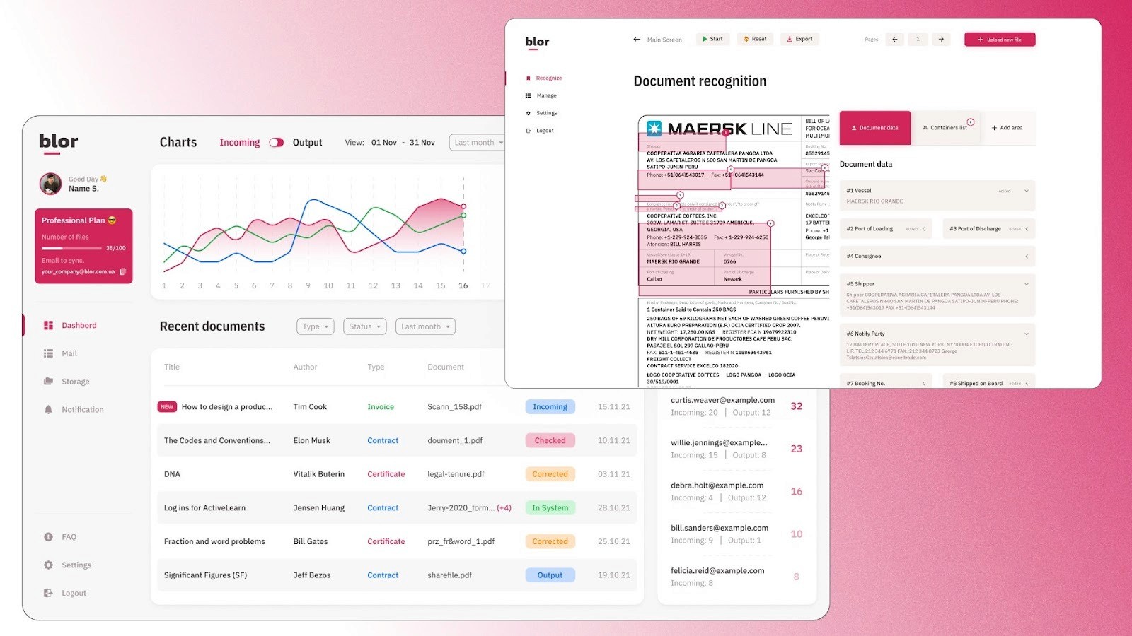 Розроблений компанією Codeska, BLOR — це спеціалізований програмний інструмент, створений на основі алгоритмів машинного навчання для автоматичного розпізнавання шаблонів документів. Наразі він зосереджений на накладних, виданих контейнерними лініями, і допомагає менеджерам заощаджувати час, усуваючи потребу в ручному введенні даних у ERP-системи. BLOR підтримує документи у форматах PDF і JPEG та містить функцію експорту, яка обробляє файли менш ніж за 15 секунд із високою точністю розпізнавання на рівні полів.